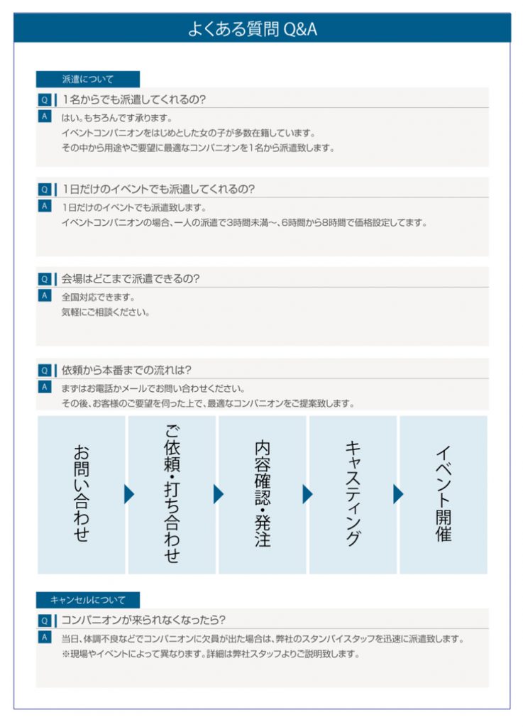 コンパニオンをご検討中の企業様へ 1名からでもOK! お客様のご要望を伺った上で、最適なコンパニオンを派遣します。まずはお気軽にお問い合わせください。 お気軽にお問い合わせください。受付時間 9:00-18:00 [ 土・日・祝日除く ] お問い合わせ お気軽に問い合わせください。